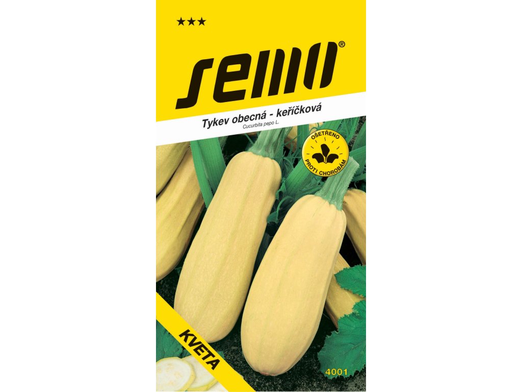 KVETA (Cucurbita pepo L.) – keříčková, lahůdková (chřestová) tykev. Plody jsou válcovité až kyjovité, v technické zralosti zelenavě bílé až žlutobílé, v botanické zralosti žluté až krémově žluté. Dužnina je žlutobílá, hustá, šťavnatá. Průměrná hmotnost plodů je 1,5 kg. Vegetační doba je 70 dnů, ze 100 m lze sklidit 600 – 650 kg plodů. Sklízíme postupně od července do září mladé plody nebo plody v technické zralosti, které můžeme upravit na tykvové zelí nebo přívařky. Spon 120 x 80 cm, 100 x 100 cm.