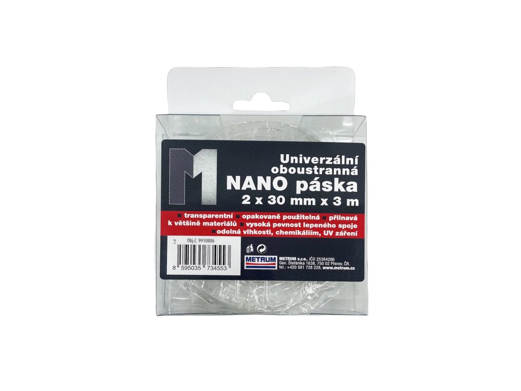 Jedná se o univerzální oboustrannou NANO pásku od Českého stavitele. Ve své podstatě je to oboustranná vysoce lepivá, a přitom snadno odnímatelná transparentní páska. Díky speciálnímu nano povrchu se tato páska vyznačuje vysokou lepivostí, ale zároveň je velmi snadno odnímatelná bez poškození povrchu a zanechání zbytků lepidla. Prostě takový malý zázrak. Úžasnou vlastností této pásky je to, že je opakovatelně použitelná a lze ji lehce omývat. Přizpůsobí se téměř každému povrchu, je transparentní, odolává vlhkosti, chemikáliím i UV záření. Takže ji můžete použít ve vnitřních i vnějších prostorách.