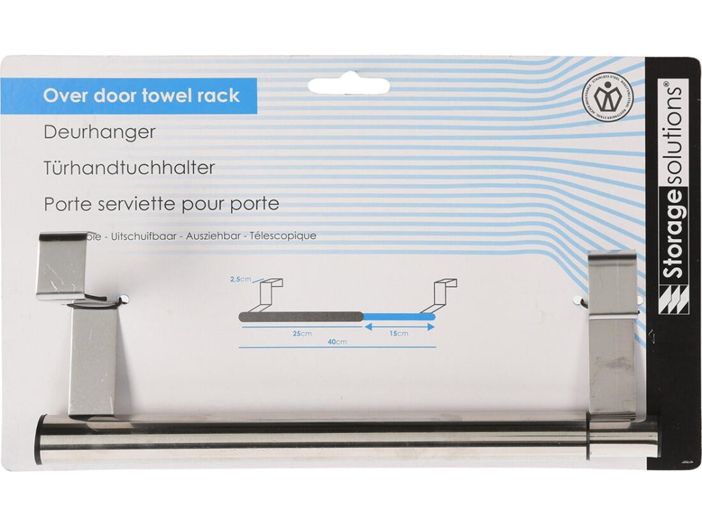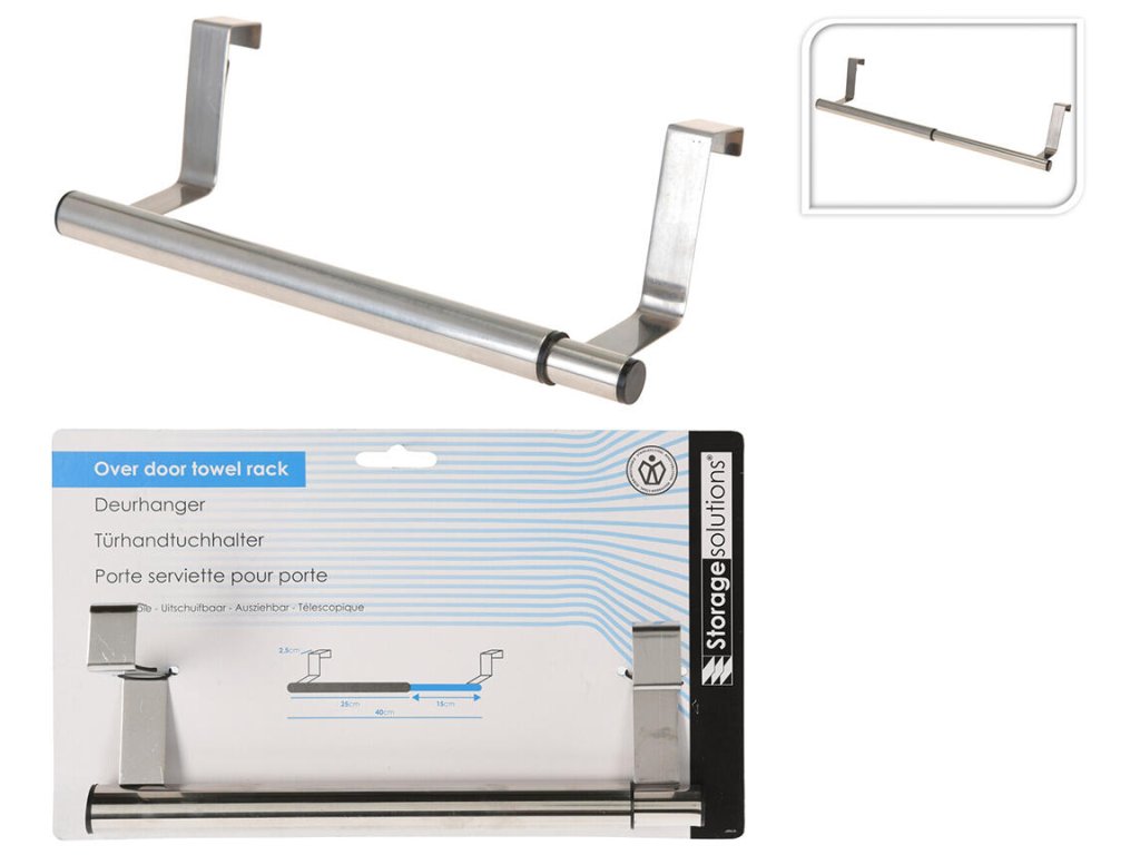 Věšák na dveře teleskopický, nerez. rozměry: 25-40 cm materiál: nerez Nemáte dostatek místa k zavěšení utěrek v kuchyni nebo ručníků v koupelně? Pořiďte si tento šikovný držák, který snadno upevníte na dveře či šuplík.Doplňkové parametry