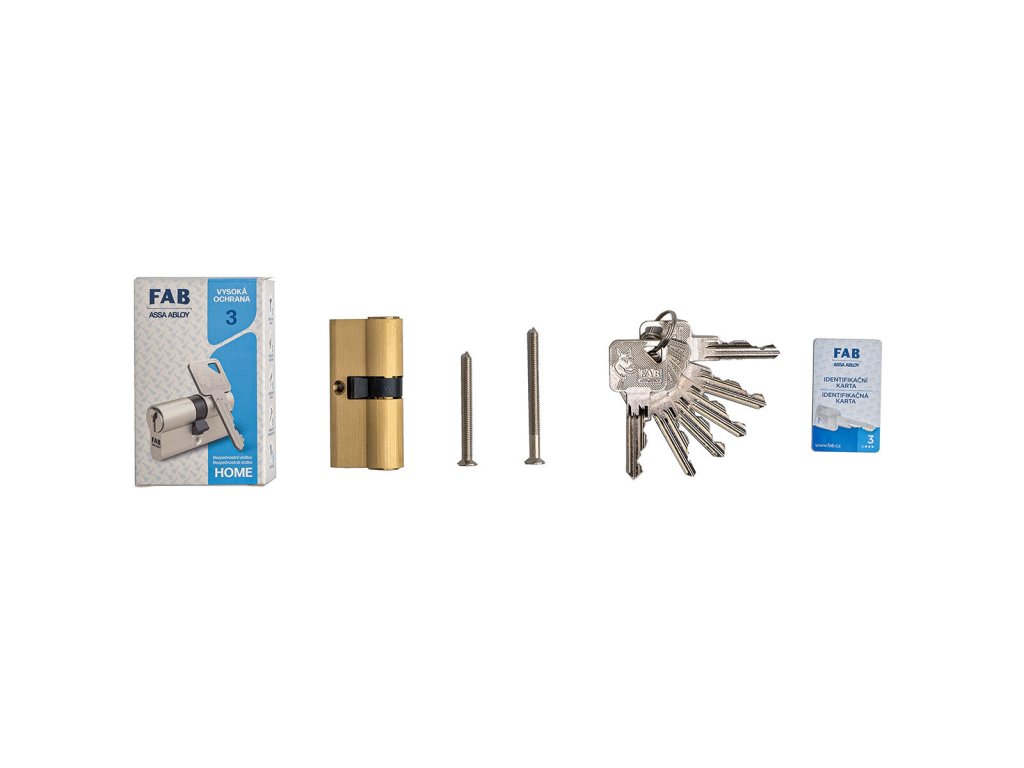 Vložka cylindrická 3H.00/BD, 30/35, 6 klíčů, MS, 3. třída bezpečnosti. Cylindrická bezpečnostní vložka FAB 3 HOME je vhodná do dveří, které vyžadují trvale vysoké zabezpečení (dveře do bytu či domu, kanceláře, atd.), vysoká úroveň zabezpečení. Ochrana proti odvrtání, pro objekty vyžadující trvale vysokou bezpečnost. 6ti stavítkový uzamykací systém. Standardně v dodávce 6 klíčů. Mosazné těleso i bubínek. Systém chráněn patentem a užitnými vzory. Patentově chráněný paracentrický profil. Rozsáhlá rozměrová řada. Identifikační karta.Doplňkové parametry