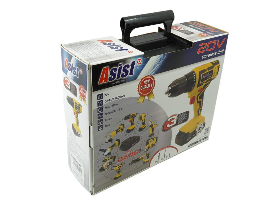 Vrtačka Aku 20 V, 2,0 Ah, v kufru, GANGSTART, s baterií a nabíječkou, ASIST. Technické parametry: - nabíjení: 230 V, 50 Hz - pracovní napětí: 20 V - maximální utahovací moment 50 Nm - nastavení utahovacího momentu: 19+1 - 2-rychlostní převodovka l. 0-400 ot/min / ll. 0-1600 ot./min - rychloupínací sklíčidlo: 13 mm - elektronická regulace otáček - akumulátor: 1 x 2000 mAh, Li-Ion (použitelný i pro jiné stroje řady ASIST AKU GANG) - kontrola stavu nabití akumulátoru - přepínač směru otáčení - v kufru - SPINDLE LOCK – zámek sklíčidla pro potřeby ručního dotažení / povolení např. vrutů - QUICK STOP - okamžitá brzda sklíčidla po uvolnění spouště - SOFT GRIP - protiskluzová úprava pro lepší uchopení - LED světlo - pro osvětlení pracovního prostoru před sklíčidlemDoplňkové parametry