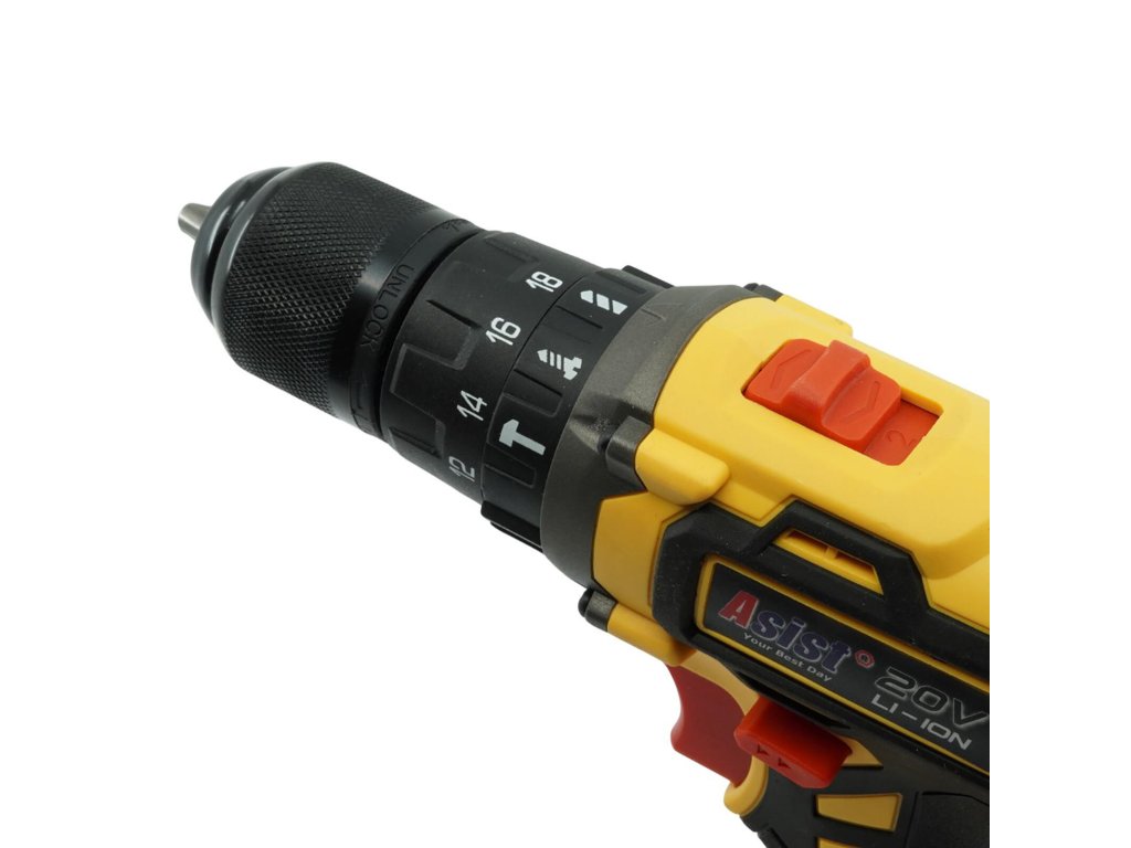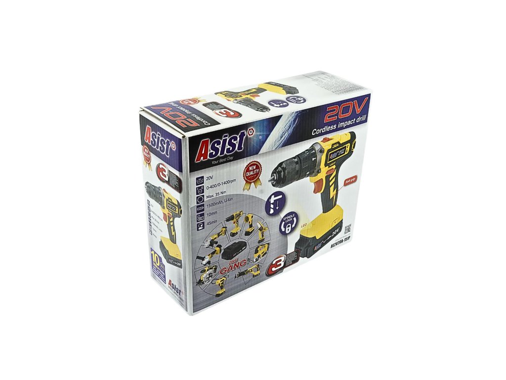 Vrtačka Aku 20 V, s příklepem, 1,5 Ah, GANGSTART, s baterií a nabíječkou, ASIST. Technické parametry: - pracovní napětí: 20 V - 2-rychlostní převodovka l. 0-400 ot/min / ll. 0-1400 ot./min - elektronická regulace otáček - akumulátor: 1 x 1500 mAh, Li-Ion (použitelný i pro jiné stroje řady ASIST AKU GANG) - kontrola stavu nabití akumulátoru - nastavení utahovacího momentu: 18+1 - maximální utahovací moment 35 Nm - přepínač směru otáčení - příklep - kovové rychloupínací sklíčidlo: 10 mm - SPINDEL LOCK – zámek sklíčidla pro potřeby ručního dotažení / povolení např. vrutů - QUICK STOP - okamžitá brzda sklíčidla po uvolnění spouště - SOFT GRIP - protiskluzová úprava pro lepší uchopení - LED světlo - pro osvětlení pracovního prostoru před sklíčidlemDoplňkové parametry