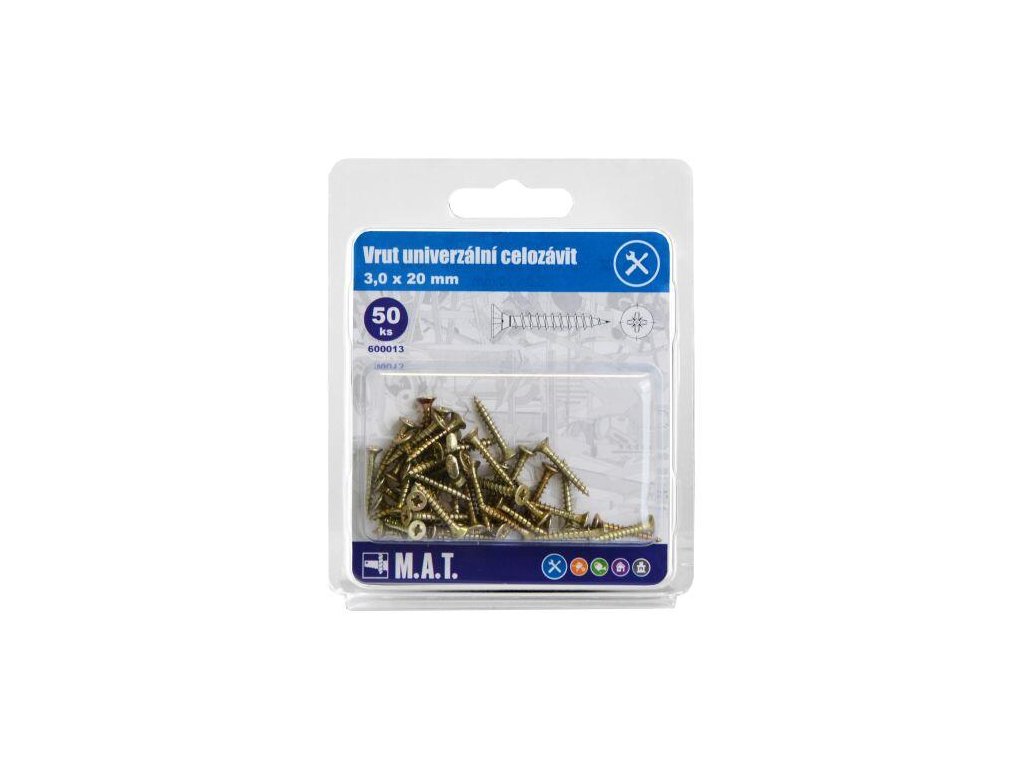 rozměry (pr. x D)): 3,0 x 20 mm materiál: Zn celozávit 50 ks Univerzální vrut je spojovací součástka s vnějším závitem, určená k vytváření rozebíratelných spojů především měkkých materiálů (dřevo, plast, sádrokarton).Doplňkové parametry