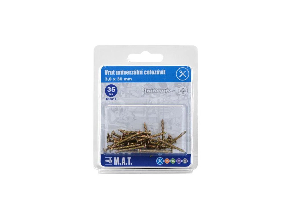 rozměry (pr. x D)): 3,0 x 30 mm materiál: Zn celozávit 35 ks Univerzální vrut je spojovací součástka s vnějším závitem, určená k vytváření rozebíratelných spojů především měkkých materiálů (dřevo, plast, sádrokarton).Doplňkové parametry