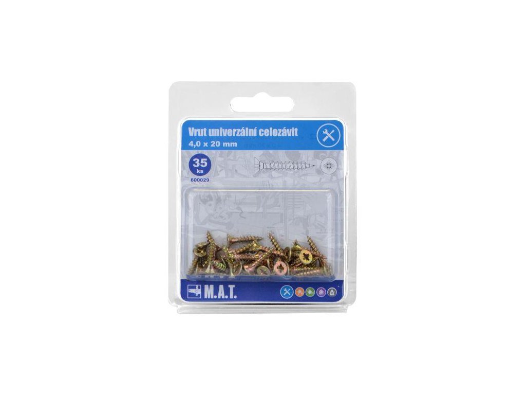 rozměry (pr. x D)): 4,0 x 20 mm materiál: Zn celozávit 35 ks Univerzální vrut je spojovací součástka s vnějším závitem, určená k vytváření rozebíratelných spojů především měkkých materiálů (dřevo, plast, sádrokarton).Doplňkové parametry