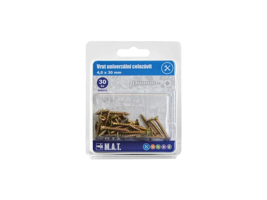 rozměry (pr. x D)): 4,0 x 30 mm materiál: Zn celozávit 30 ks Univerzální vrut je spojovací součástka s vnějším závitem, určená k vytváření rozebíratelných spojů především měkkých materiálů (dřevo, plast, sádrokarton).Doplňkové parametry