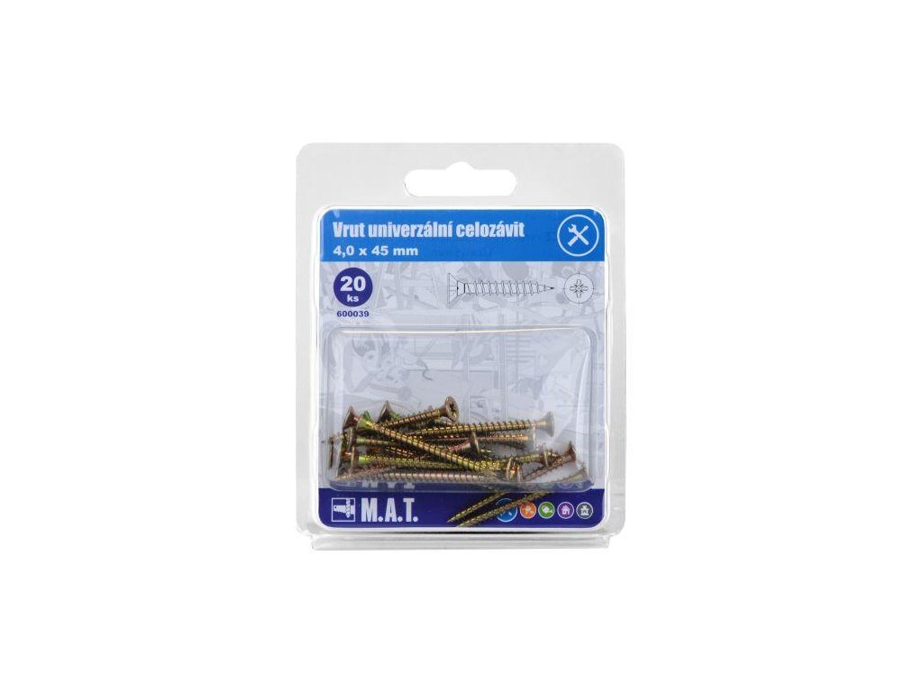 rozměry (pr. x D)): 4,0 x 45 mm materiál: Zn celozávit 20 ks Univerzální vrut je spojovací součástka s vnějším závitem, určená k vytváření rozebíratelných spojů především měkkých materiálů (dřevo, plast, sádrokarton).Doplňkové parametry
