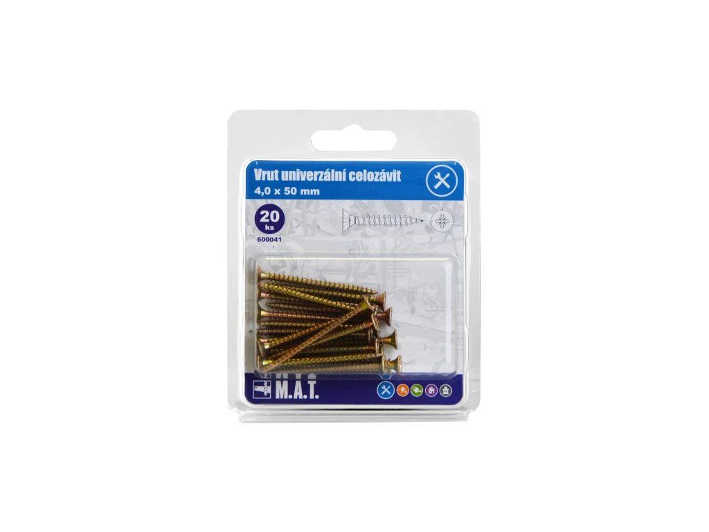 rozměry (pr. x D)): 4,0 x 50 mm materiál: Zn celozávit 20 ks Univerzální vrut je spojovací součástka s vnějším závitem, určená k vytváření rozebíratelných spojů především měkkých materiálů (dřevo, plast, sádrokarton).Doplňkové parametry