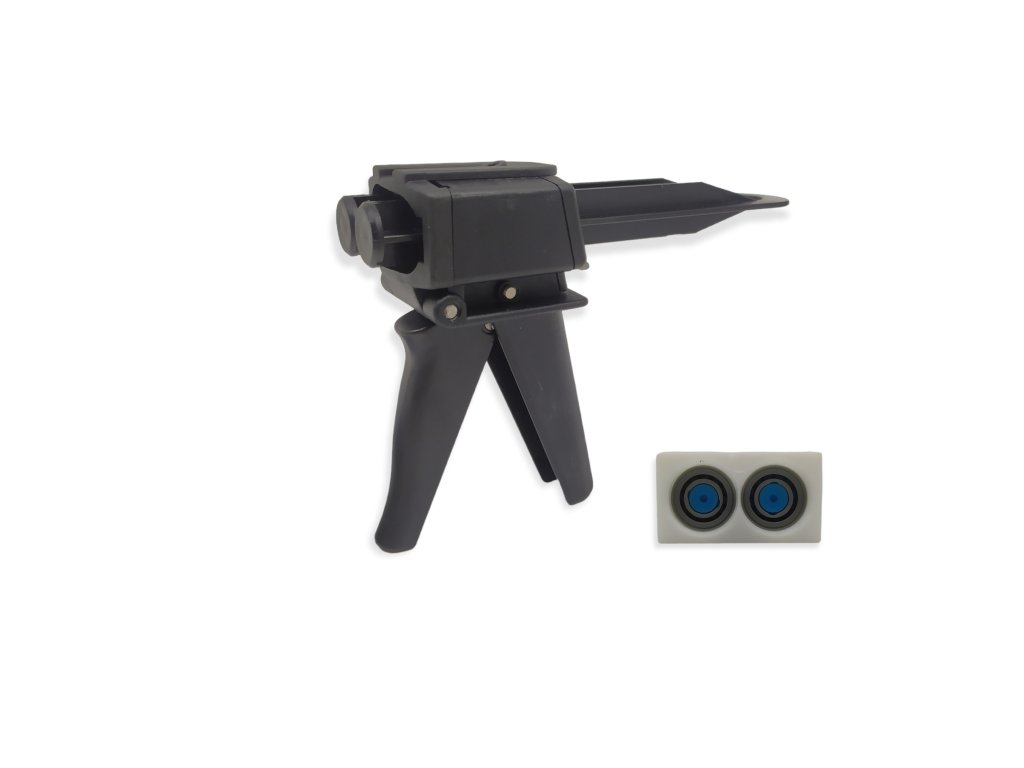 Dávkovací pistole pro dvousložková lepidla v dvojkartuši, o objemu 50ml. Pistole pro dvousložková lepidla v dvojkartuši (1:1) pro plynulé a přesné dávkování (vytlačování) lepidla z dvojkartuše. Tělo pistole z odolného plastu.Určeno pro kartuše s obdelníkovou základnou (hranaté dno).