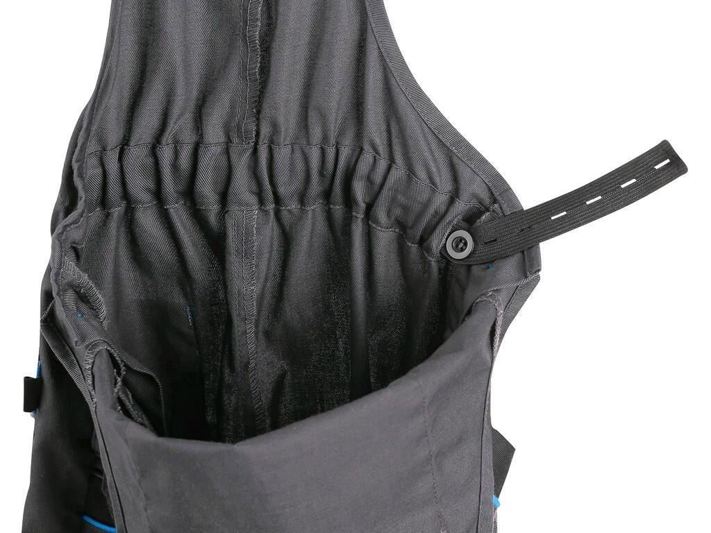 Dětské kalhoty s náprsenkou, z lehkého materiálu, náprsní kapsa na zip, boční zapínání na knoflíky, v zadní části guma s knoflíkem pro přizpůsobení velikosti, přední klínové kapsy, zadní jednoduchá kapsa, zesílená kolena, šle vzadu do gumy, reflexní doplňky.Doplňkové parametry