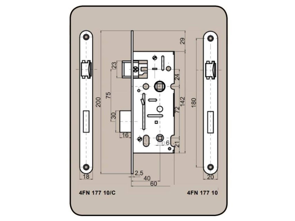 - zámek bez převodu, vhodný do dveří, které nemají zvýšený nárok na bezpečnost. Závora se ovládá ořechem závory se čtyřhranným otvorem 6 mm. Zámek je možné měnit na levý nebo pravý pootočením střelky zámku o 180°