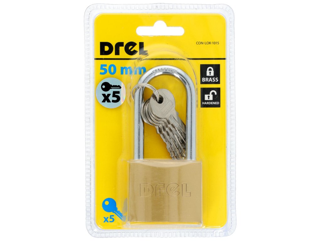 Zámek visací 50 mm, prodloužený, Ms, 5 klíčů. šířka: 50 mm materiál: mosaz 5 klíčů Prodloužený visací zámek 50 mm je vhodný pro ochranu Vašeho majetku a nejlepší prevencí proti krádeži.Doplňkové parametry
