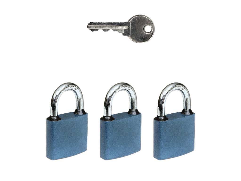 Zámek visací OVAL.45 SET 3 zámků na SU 6 kl. Set 3 ks visacích zámků na společný uzávěr – „SU“. Náhodný kód klíče. Klasický litinový zámek. Třmen HARDENED, jištěný ve dvou bodech. Gumové kroužky chránící litinové těleso proti průniku vody. Zamykání bez klíče - zatlačením třmenu. Vložka zámku s 5 odpruženými stavítky. povrchová úprava: modrý komaxit hmotnost netto: 0,57 kg / set Balení vč. 6 ks klíčů.Doplňkové parametry