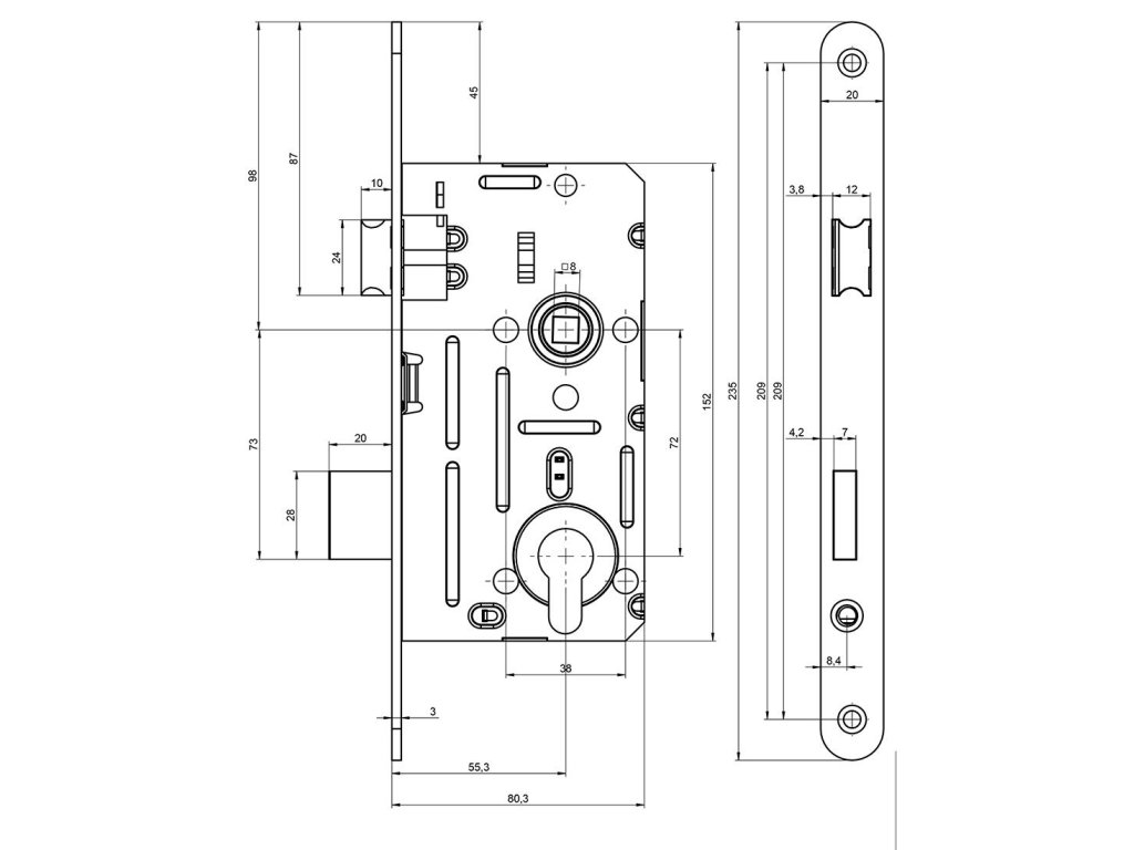 Zámek zadlabací 190/140/18 72/80 L ZZ vložkový. Mechanický zadlabací zámek ovládání cylindrickou vložkou - dvouzápadový, levý - zámek s převodem (střelku lze ovládat přes cylindrickou vložku) - určeno pro jednokřídlé dveře - otvory v bočních deskách o průměru 8mm umožňují použití dvoudílného kování (rozetové) - rozteč 72 mm, zádlab 80 mm, backset 55 mm, šířka čela 18 mmDoplňkové parametry