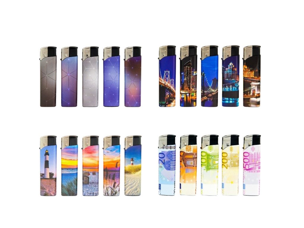 Piezoelektrický zapalovač s regulací plamene a doplňovacím ventilem. Ideální také pro zapálení grilu, krbu, svíček, cigaret, doutníků atd. Zapalovač má regulaci plamene. Způsob plnění propan-butanovým plynem. V display kartonu je mix dekorů zapalovačů.