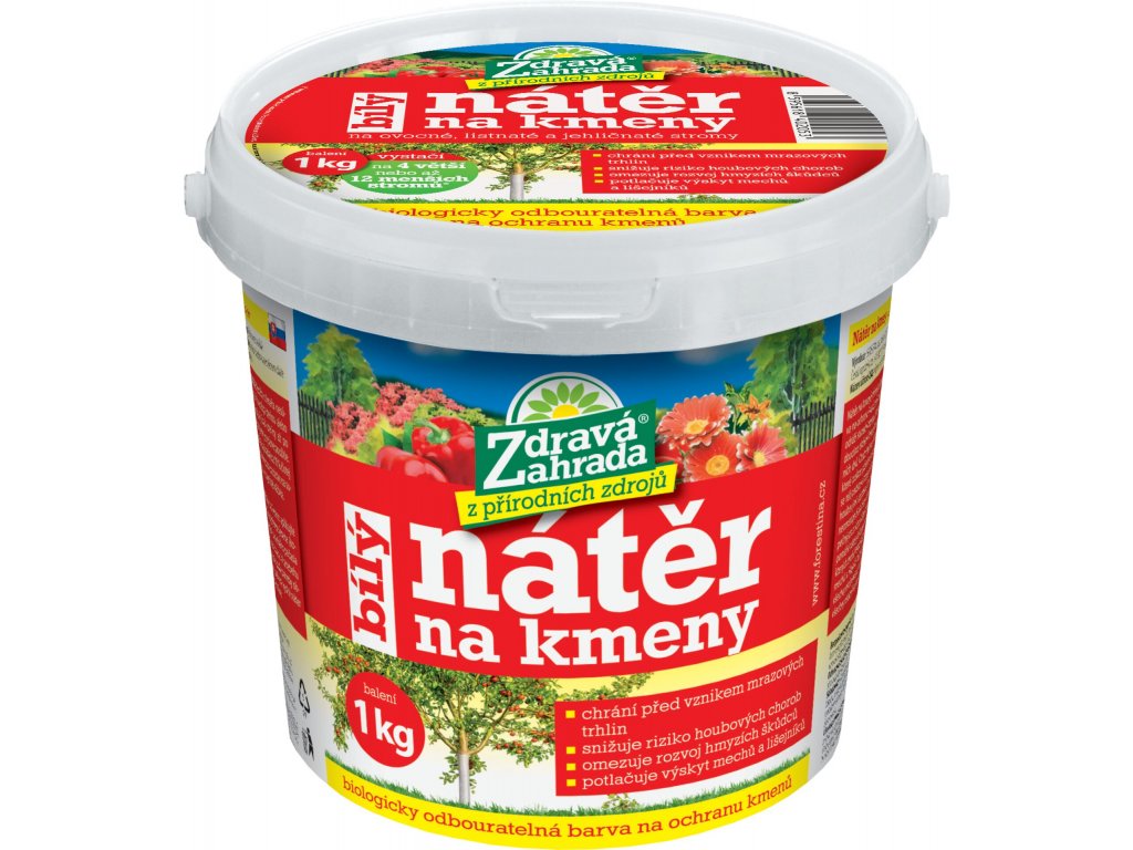 Biologicky odbouratelná barva na ochranu kmenů stromů a keřů. Bílá barva odráží sluneční paprsky a chrání před výkyvy teplot. Snižují riziko napadení dřevin houbovými chorobami a před výskytem hmyzích škůdců a také mechů a lišejníků. Na všechny druhy ovocných stromů a keřů a také okrasné dřeviny. Aplikace možná od druhé poloviny podzimu (konec října - listopad). Během zimy dle potřeby nátěr obnovit. Za optimálních okolností vydrží nátěr minimálně 4 měsíce. Natírá se celý kmen dřeviny až po spodní větve.